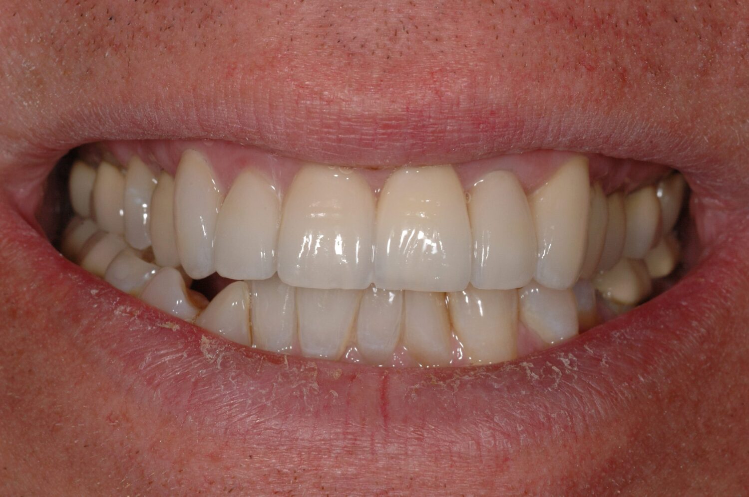 Na verwijdering van het tandje is direct een implantaat (met een kunststof tijdelijke kroon) geplaatst. Na enkele weken is een witte Zirconium opbouw en een Zirconium kroon geplaatst. Deze kroon werd in het laboratorium in het bijzijn van de patiënt afgewerkt, zodat het een exacte kopie van zijn andere voortand is geworden en deze totaal niet opvalt wanneer hij breeduit lacht.